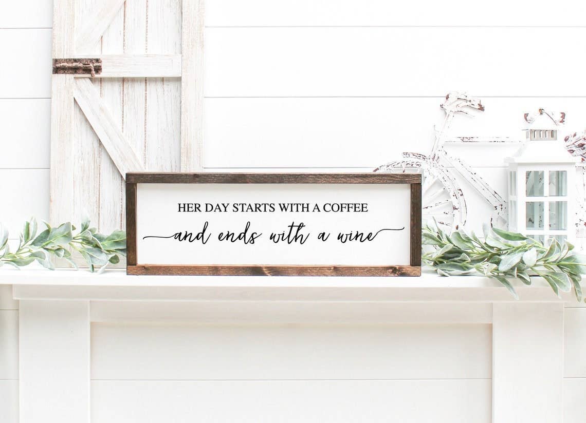 Wooden Sign Her Day Starts With A Coffee & Ends With A Wine - Hand Painted Wood Wall Decor Sign with Frame